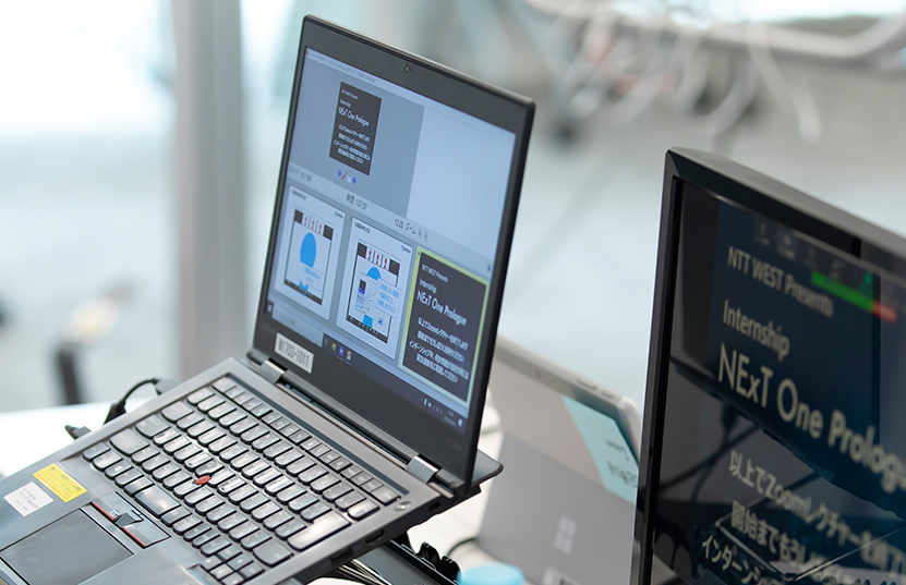 夏のNExT One Prologueから始まりトータルで約半年間に及んだインターンシップの最後の課題は「町をスマートシティに変えるソリューション提案」でした。長期間、グループメンバーと密にWeb会議を重ねたり、ターゲットとした自治体まで実際に足を運んで状況を調べたり、まるで本当のビジネスに挑戦するようなテーマに真剣に取り組みました。途中でNTT西日本の先輩社員から、的確なアドバイスを受けて提案内容を一からやり直したこともあります。